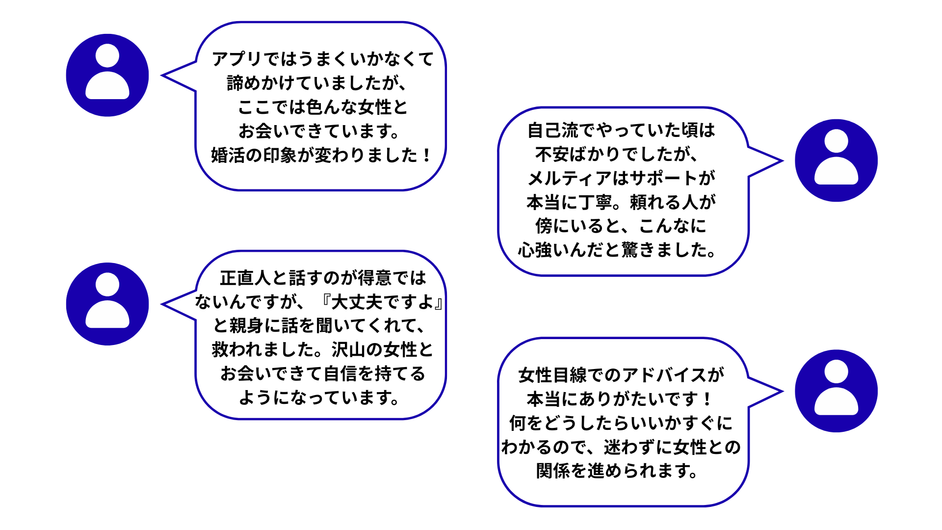 女性目線の恋愛アドバイスはもちろん、服装や髪型など男性としての魅力を上げるポイントも一緒に考えながらサポートします。これまでの恋愛サポート経験を活かして、メルティアにご入会いただいた皆さんが安心して婚活できるよう、最後まで寄り添います。